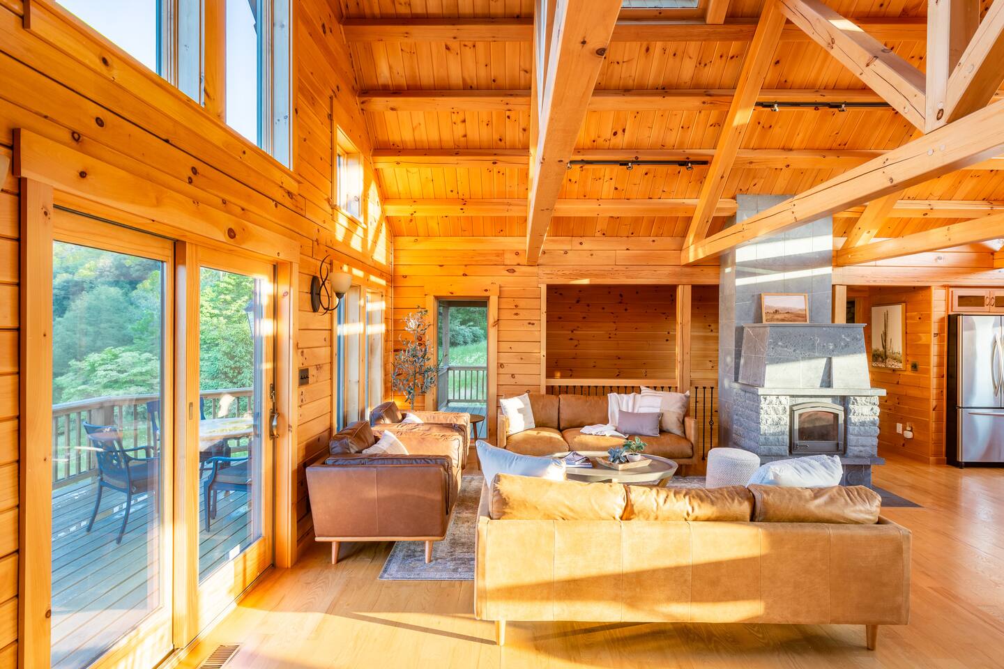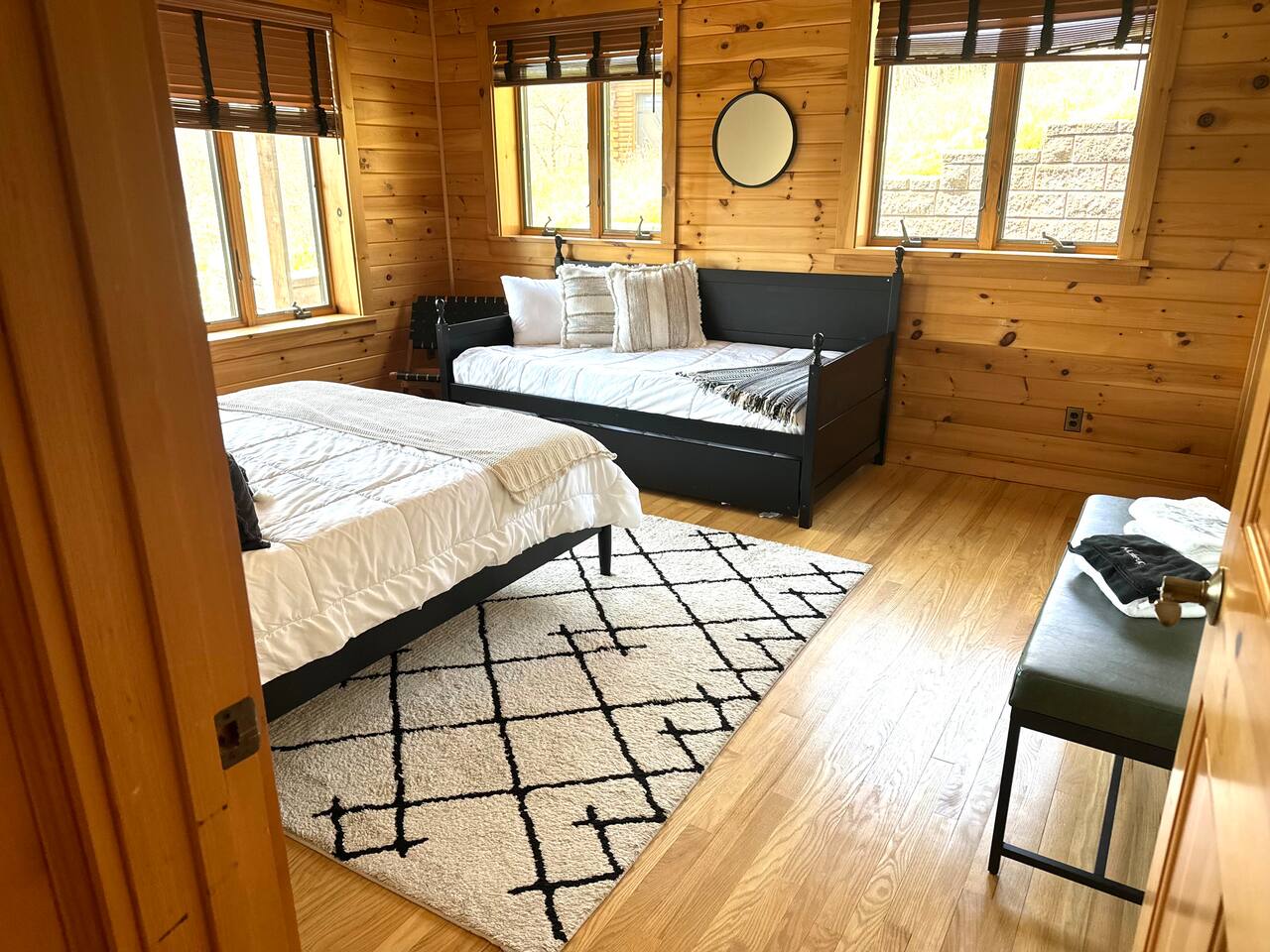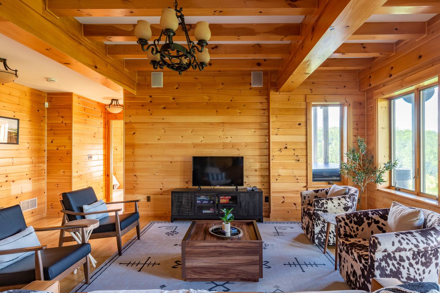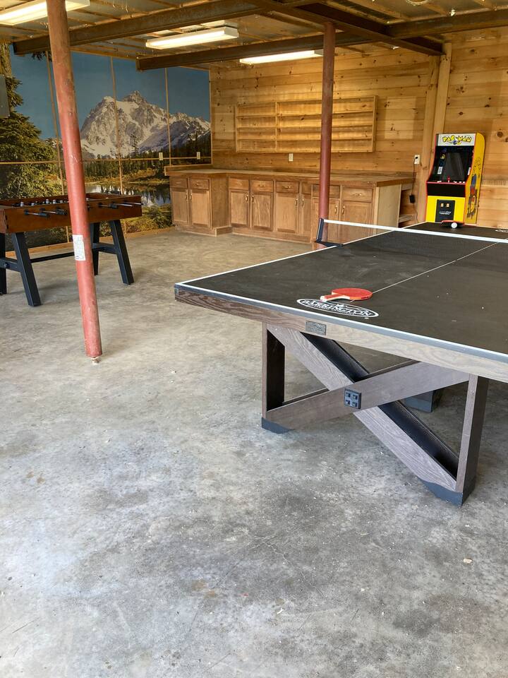 This newly furnished 5 bedroom, 2.5 bath cabin is the perfect family and friends getaway! It has been decorated and designed to be the optimal relaxing space with tons of cozy seating areas. Private Hot Tub! The Breeo fire pit outside, is ideal for cozy fires with friends or family. There's a large front porch, oversized game room, patio, large deck, upstairs and downstairs living rooms, and so much more to explore at this incredible cabin! 1st Floor: - Kitchen (Starter pack supplied: Trash bag, dish soap, dish rags, sponge, detergent tablet - we do recommend you and your family bring extras of these items if you think you will need them.) - Living Room (floor to ceiling fireplace and spectacular views, fireplaces not for guest use) Dining Room (Huge dining table for the whole family) Desk/work area Entryway with plenty of storage Large pantry Large Front porch - Large Deck - Bedroom 1 (Master Suite): Queen Bed w/ a toddler bed in the oversized closet, including a full bathroom with jacuzzi tub and shower Bedroom 2: Two Bunk Beds - Half bathroom accessible from common area Lower Daylight Level: Bedrooms 3 + 4: Queen Bed with a trundle bed for 2 people and attached private room with bunk bed for two people (perfect for a family, sleeping 6 total people between the two connected rooms!) Full Bath accessible through common area - Bedroom 5: Queen Bed - Laundry room - Seating area (with toys, TV and Nintendo for those rainy days) - Queen sleeper sofa - Walkout patio Outside: - Breeo firepit area (wood provided) - Oversized Game Room with arcade games, ping pong, foosball and lounge area (not heated or cooled, but you can open the doors to let that cool mountain breeze inside) - HOT TUB - Yard space